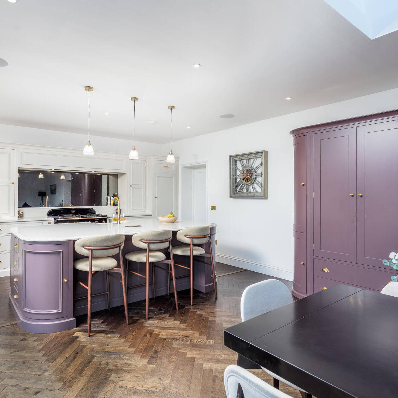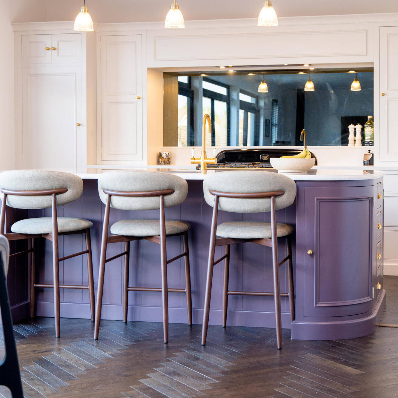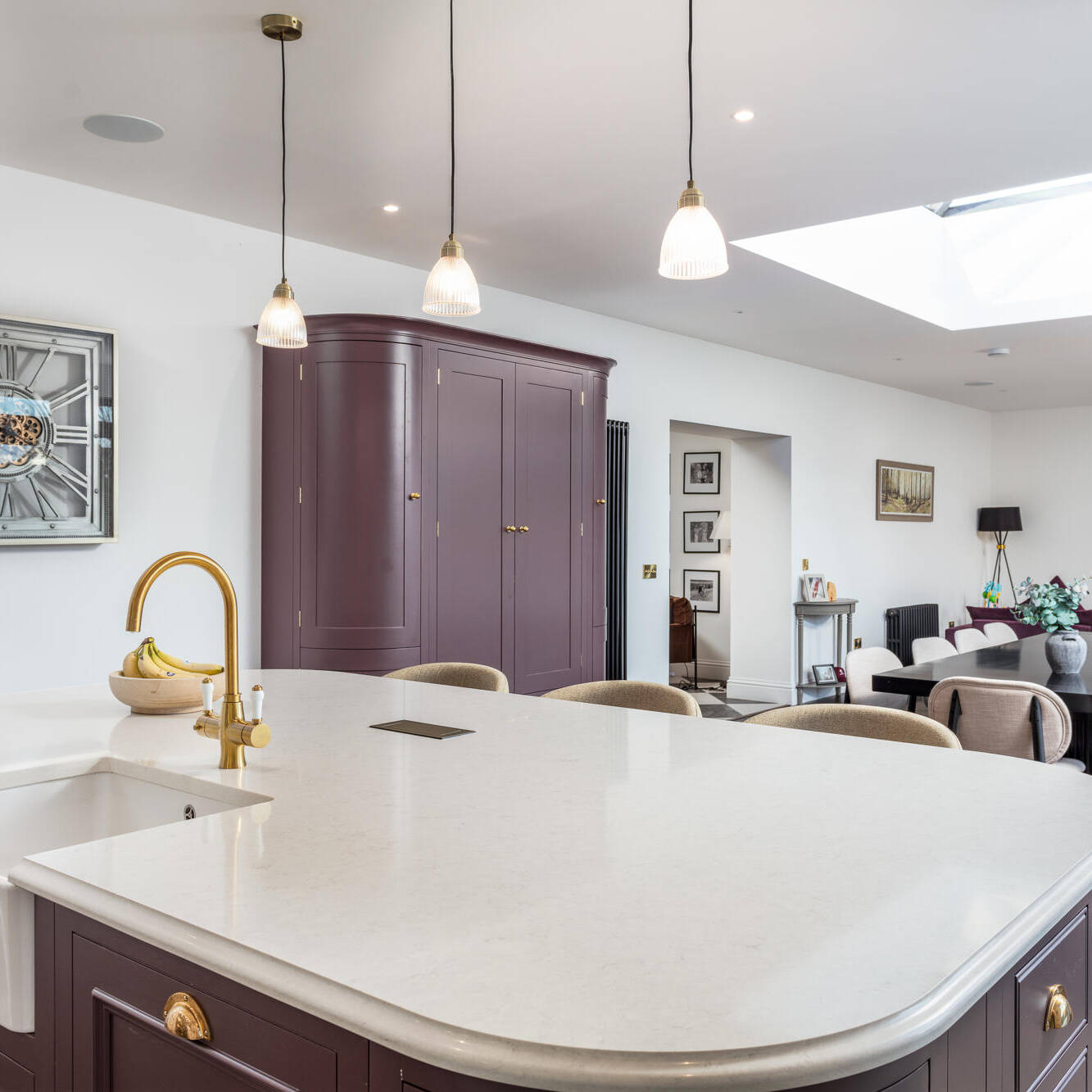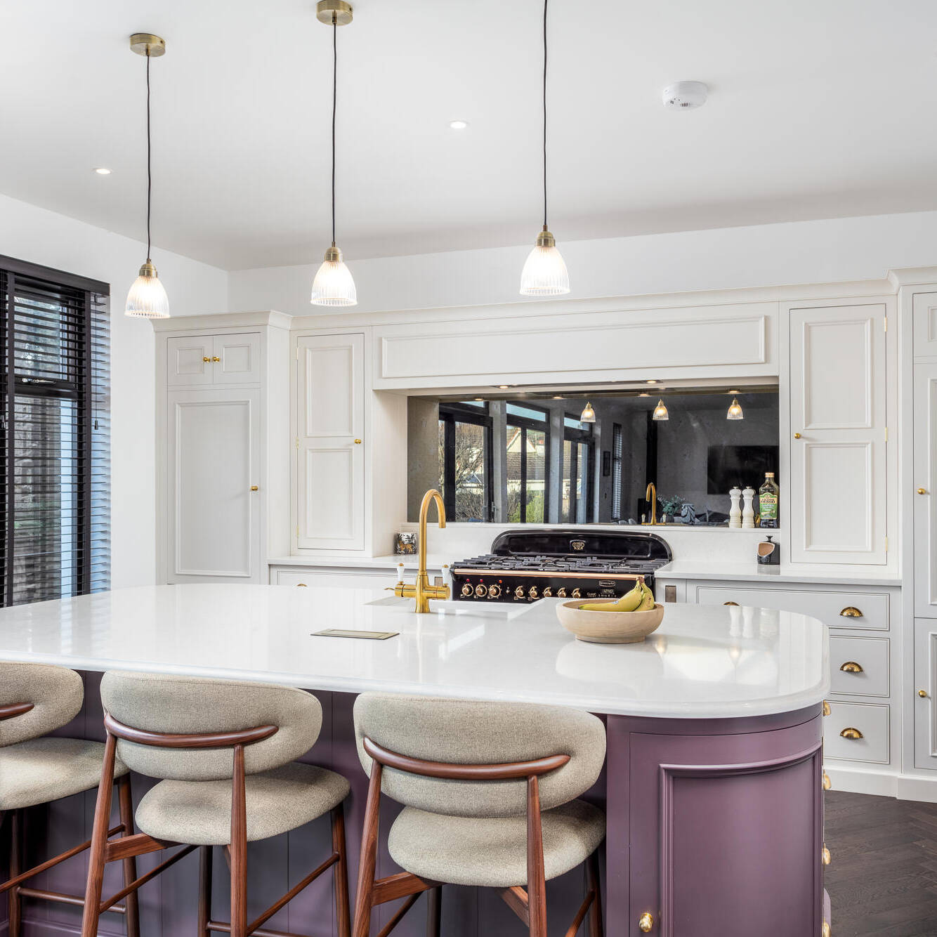 This Chichester kitchen painted in Silver Birch & Clove features curved corners and brass accents for an impactful, luxurious kitchen space.