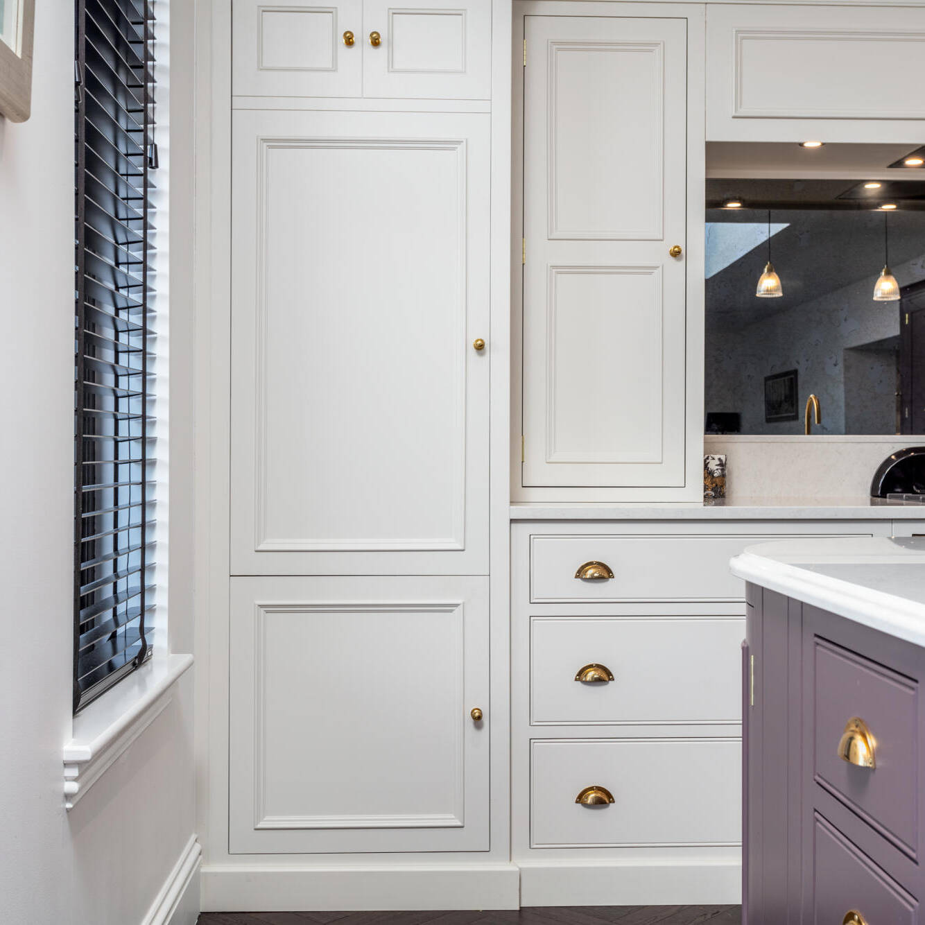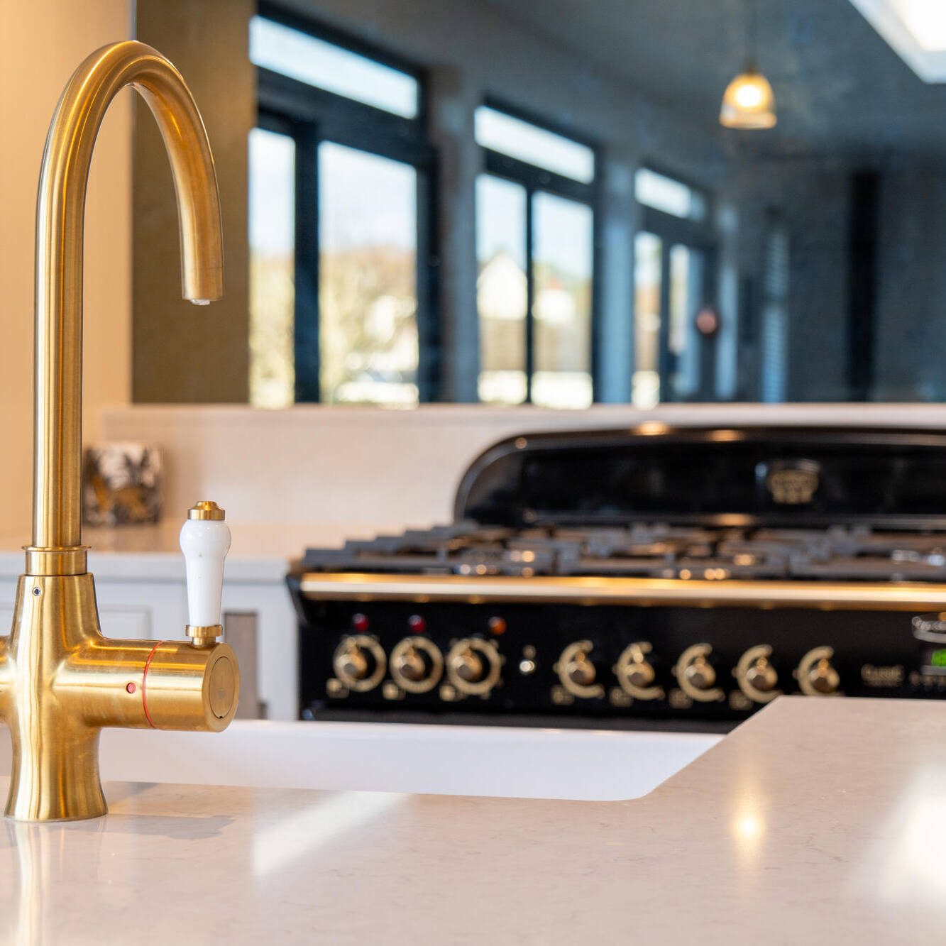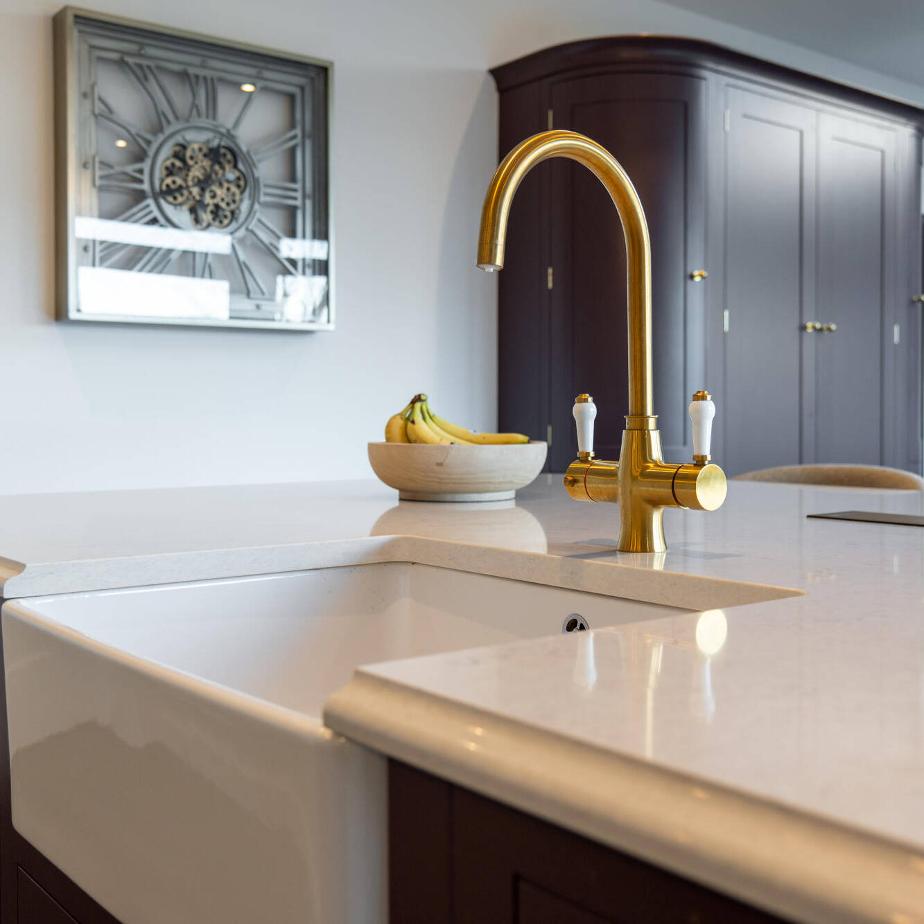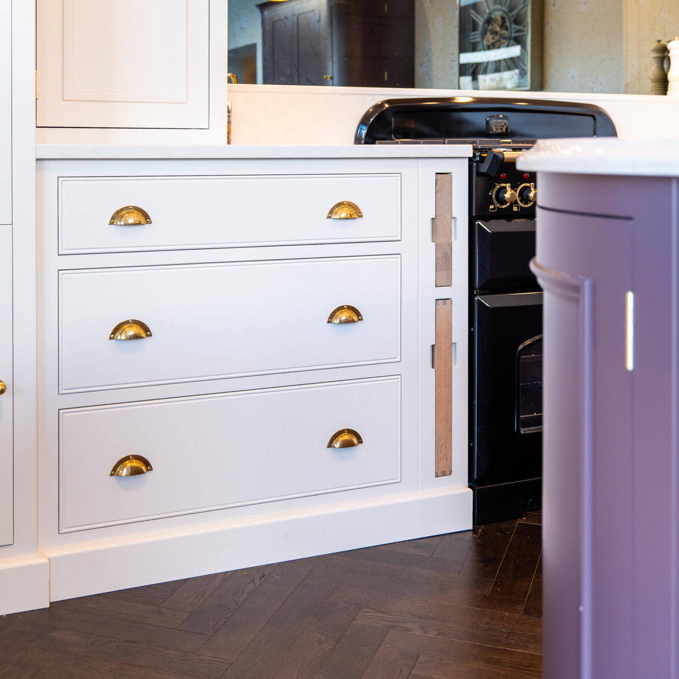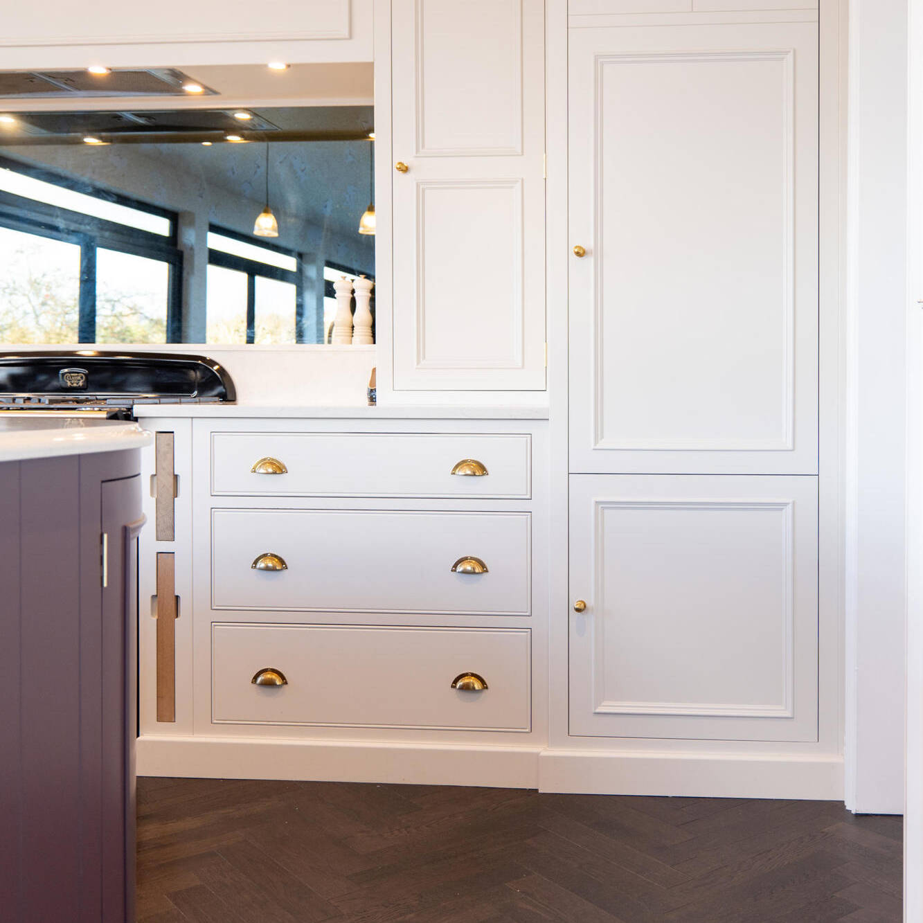 This Chichester kitchen painted in Silver Birch & Clove features curved corners and brass accents for an impactful, luxurious kitchen space.