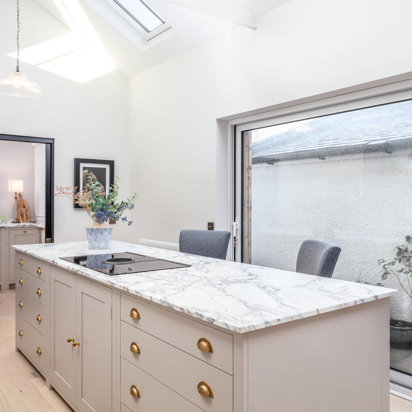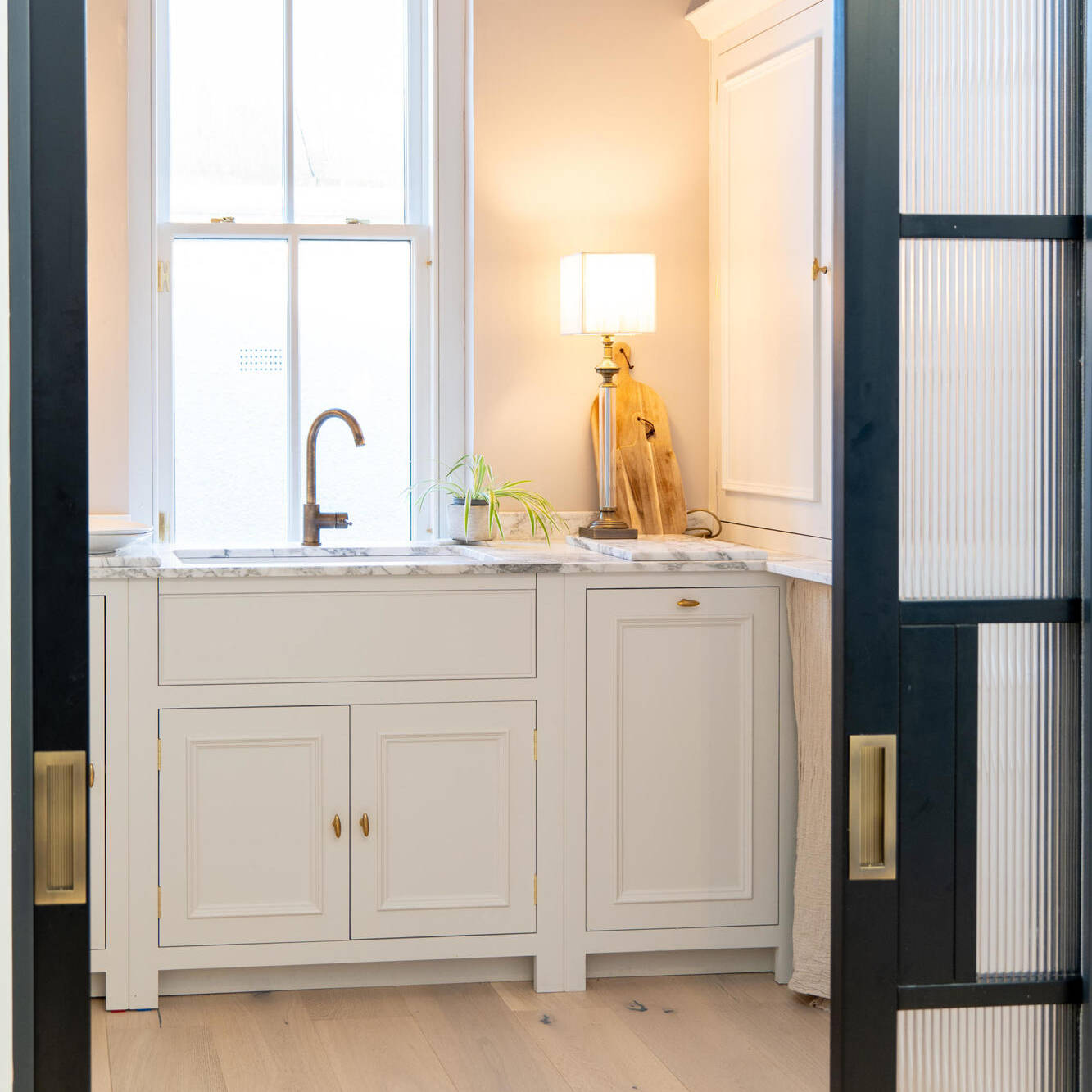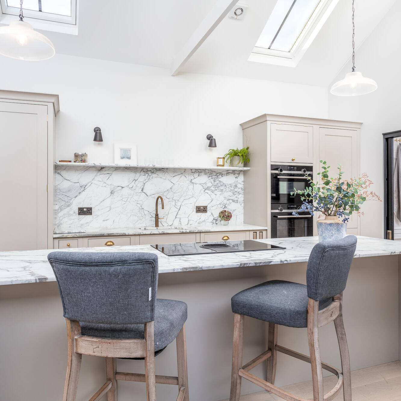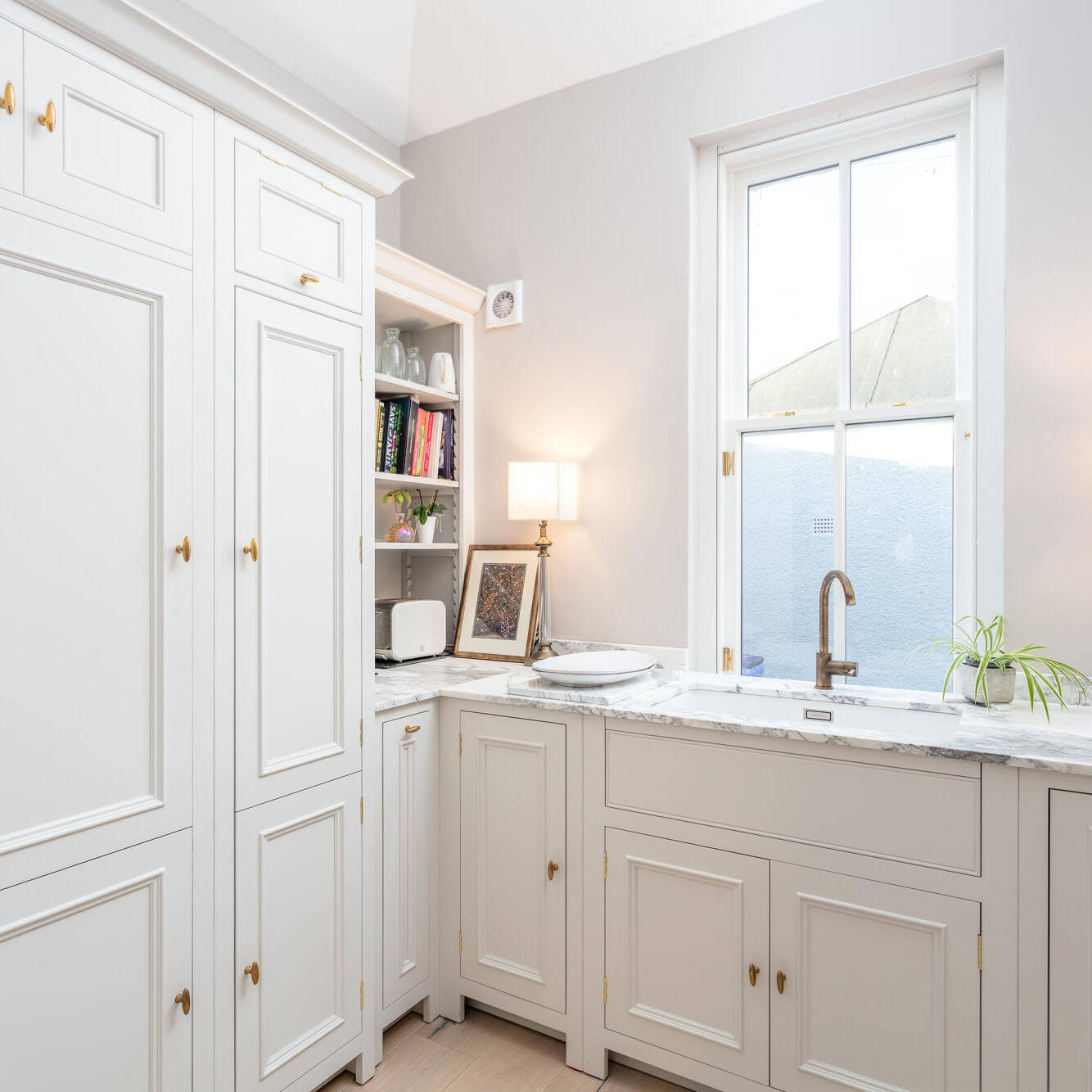 A perfectly formed Chichester utility room is tucked away within this light and bright Suffolk kitchen, both complimented by stunning marble worksurfaces