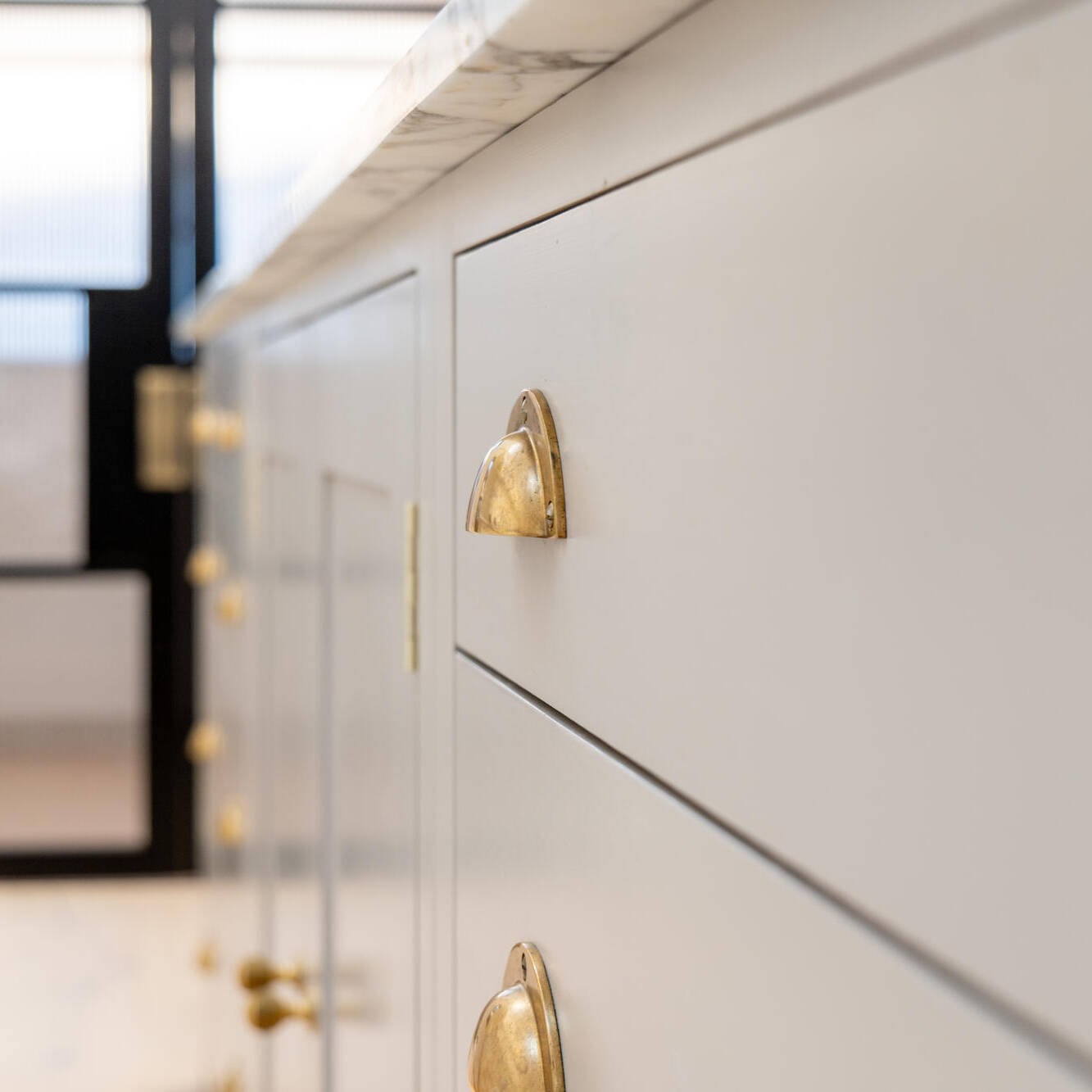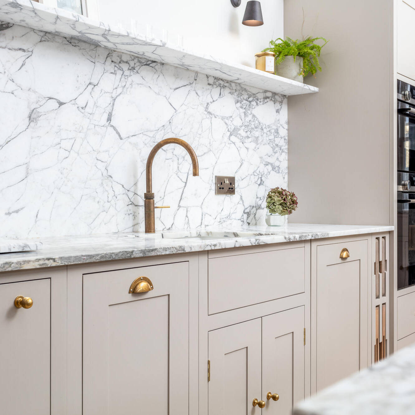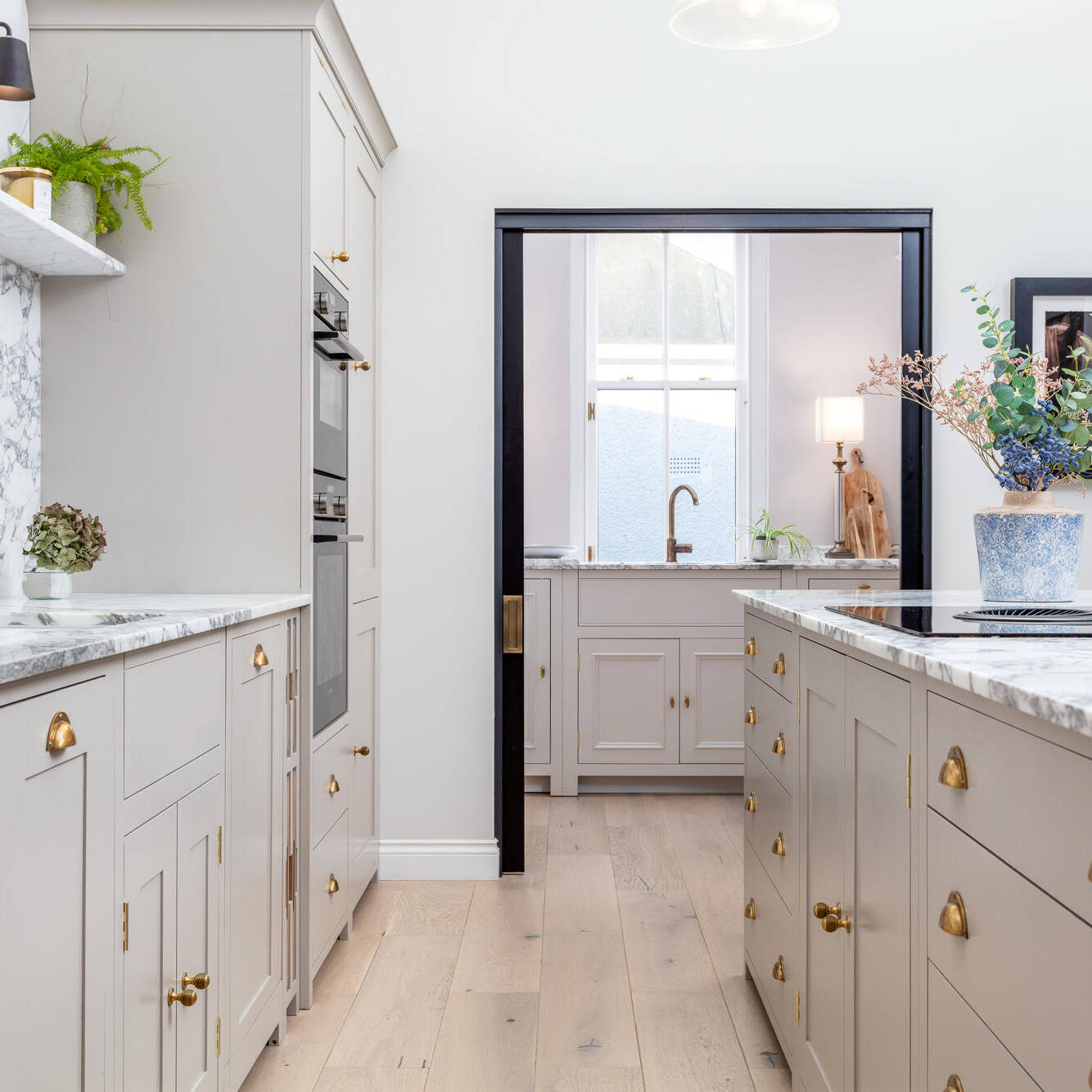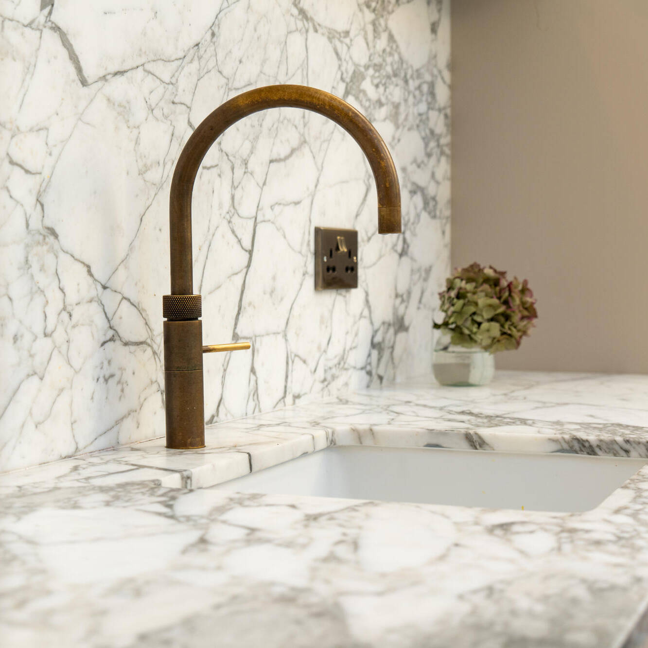 A perfectly formed Chichester utility room is tucked away within this light and bright Suffolk kitchen, both complimented by stunning marble worksurfaces
