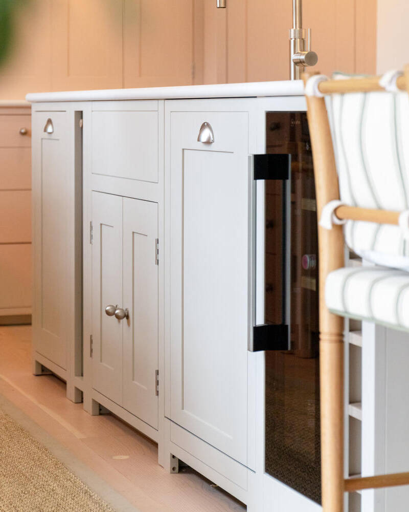 Kitchen with a mix of Henley & Suffolk cabinetry painted in Driftwood with chrome hardware