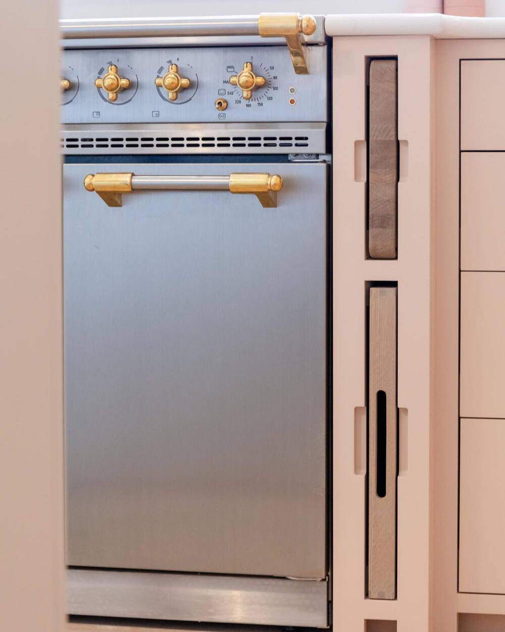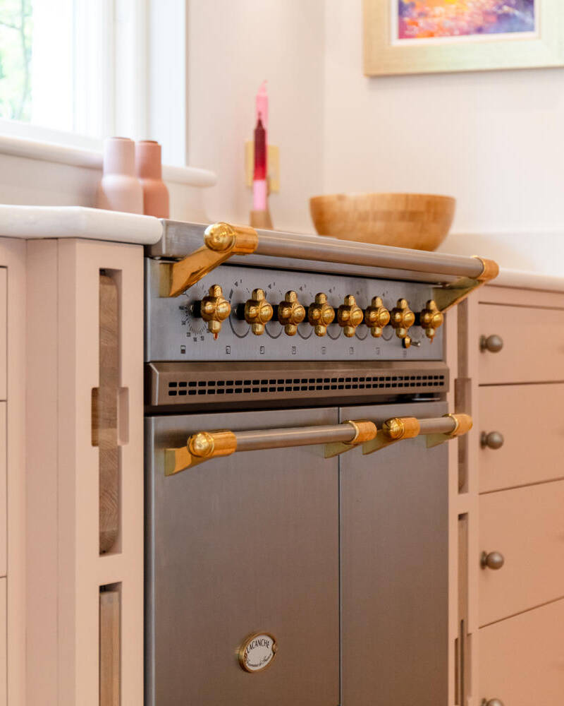 A family friendly kitchen and dining space featuring a Lacanche range cooker, solid oak island cabinets and beautiful brass accents
