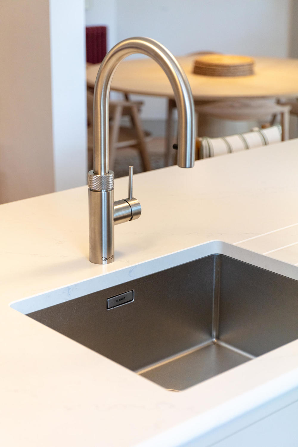 A perfectly formed Chichester utility room is tucked away within this light and bright Suffolk kitchen, both complimented by stunning marble worksurfaces