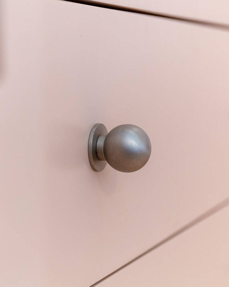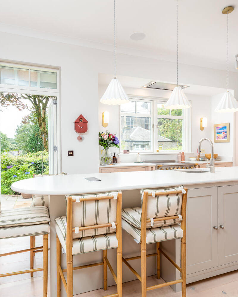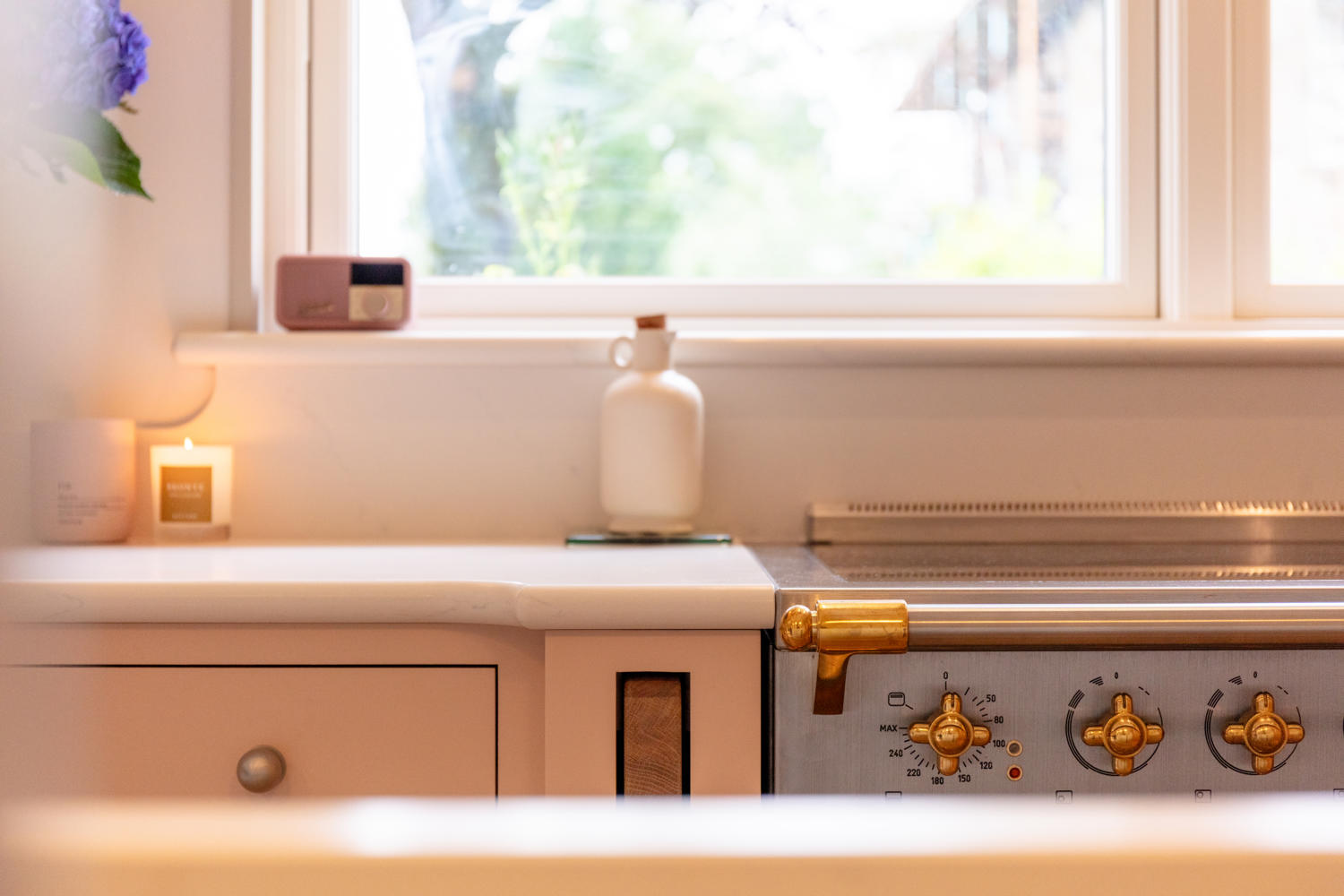 This Chichester kitchen painted in Silver Birch & Clove features curved corners and brass accents for an impactful, luxurious kitchen space.