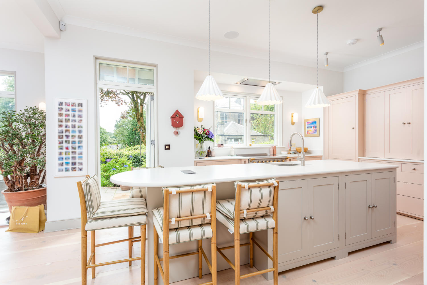 A large island in an open plan family kitchen space. The cabinetry is Suffolk, painted in Driftwood with brass bar handles
